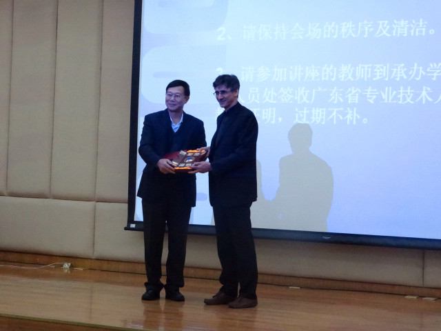 12月4日下午,由我校人事处主办、翻译学研究中心承办的著名教授讲坛第196讲在北校图书馆负一层报告厅举行。来自意大利萨伦托大学的大卫·卡坦(David Katan)教授带来了题为“翻译的跨文化交流特征——探寻文化冰山隐藏的本质(Translation as Intercultural Communication——Below the Tip of the Cultural Iceberg)”的讲座。我校党委副书记陈建平,翻译学院副院长赵军峰,商英学院副院长何家宁,加拿大研究中心常务副主任唐晓松等出席了讲座。翻译学研究中心主任莫爱屏担任此次讲座主持人,陈建平代表我校向大卫·卡坦赠送了纪念品。