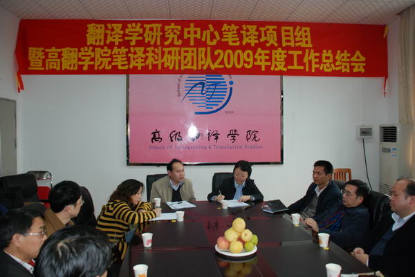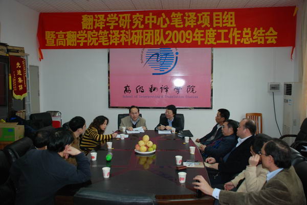 2010年1月19日下午,翻译学研究中心笔译项目组/高翻学院笔译科研团队2009年度工作总结会在高级翻译学院会议室召开。会议邀请科研处阳爱民副处长、高翻学院平洪院长、高云坚书记、詹成副院长、MTI教育中心赵军峰主任、科研处潘相宇科长出席,除莫爱屏教授因出国访学不能到会外,翻译学研究中心笔译项目组与高翻学院A类科研创新团队全体成员及科研秘书参加了会议。