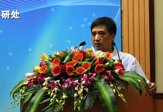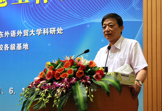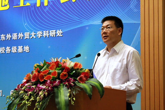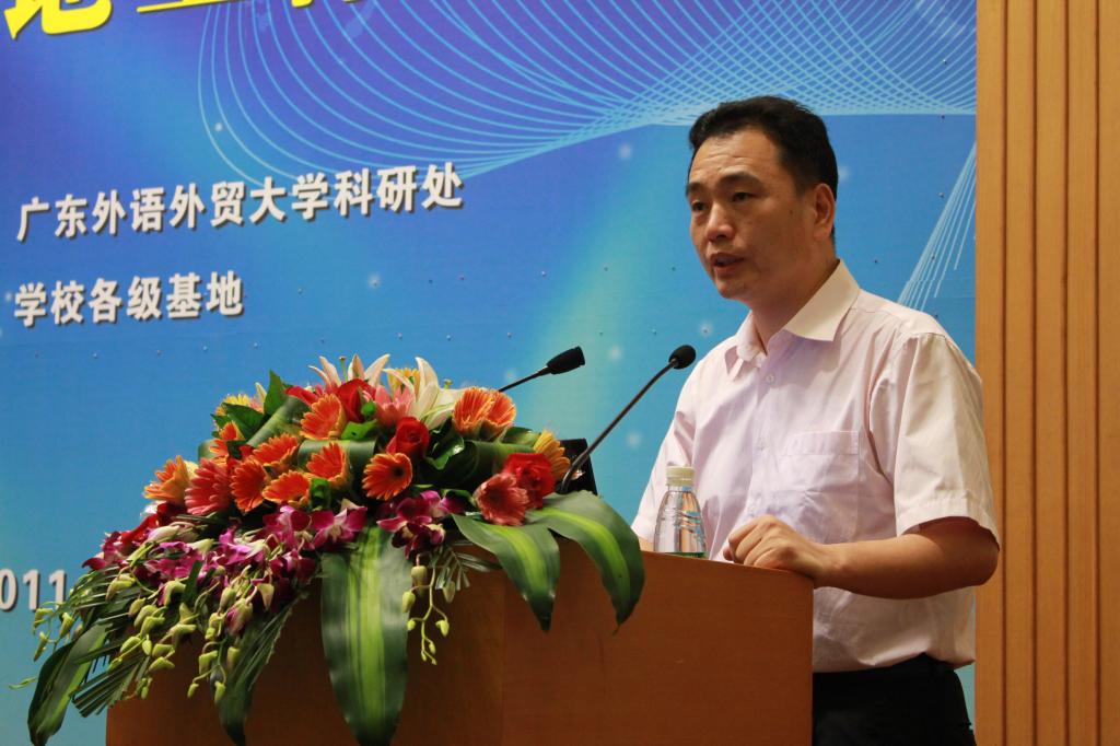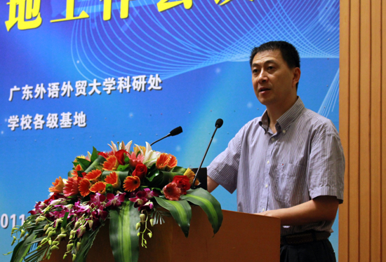 隋广军在致辞中向与会嘉宾介绍了我校近年来的科研工作的主要情况。他指出,我校作为华南地区国际化人才培养的重要基地,重视科学研究,创新发展模式,精心构建科研发展平台,借助“国家级—省级—市级—校级”四级人文社会科学重点研究基地,在深化科研管理机制改革、创新科研成果服务社会等方面取得可喜成果,从而提升了我校的社会贡献度。隋广军提出希望:进一步规范各级基地管理,打破学科间的封闭状况,互通有无,并使人文社会科学重点研究基地得到可持续发展。