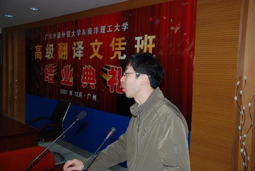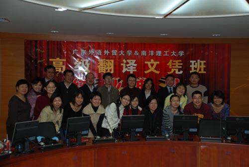 2007年12月23日下午我院与新加坡南洋理工大学人文与社会科学学院合办的第二期高级翻译文凭班结业典礼在六教同声传译实验室圆满召开。出席典礼的有穆雷院长,高级翻译学院部分任课教师以及全体15位学员,会议由詹成老师主持。